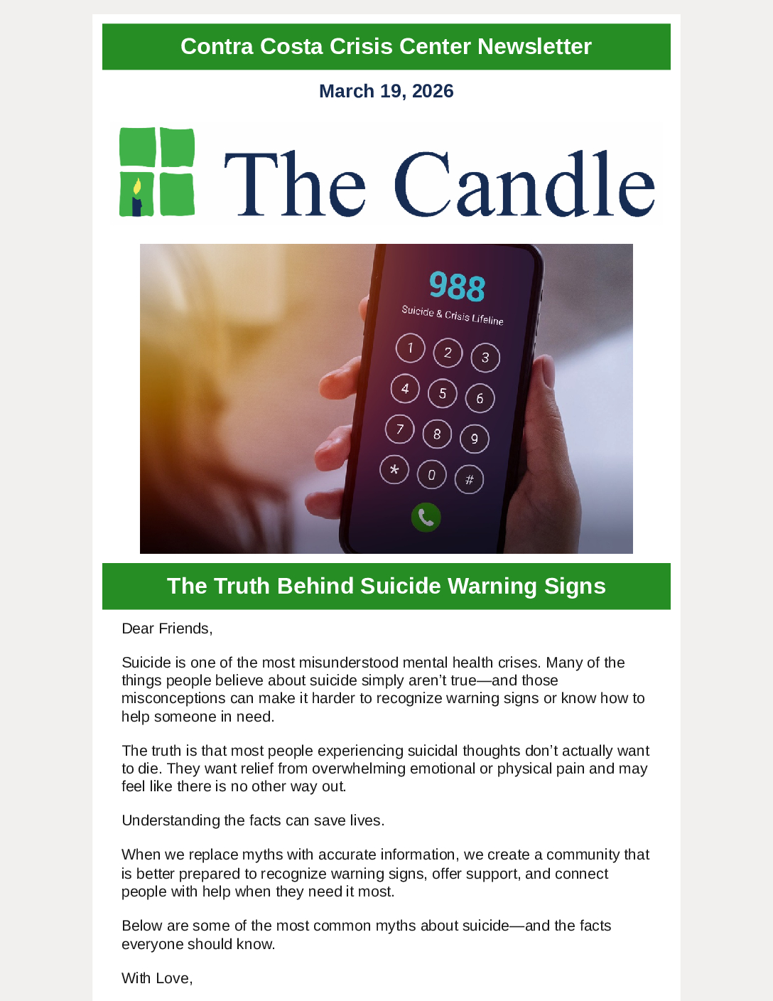 988 is not shutting down. Contra Costa Crisis Center remains proud to be a crisis center in the 988 Suicide and Crisis Lifeline Network. Despite recent confusion and viral misinformation, the 988 Suicide & Crisis Lifeline remains fully operational, providing free, confidential support to people across the U.S. 24/7.